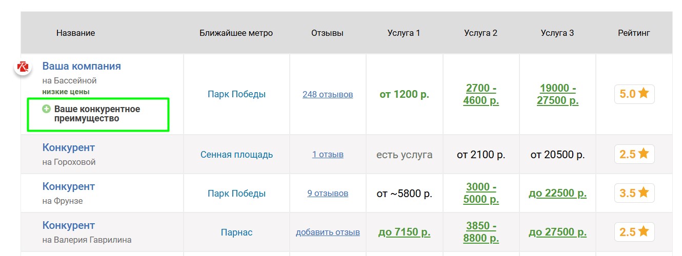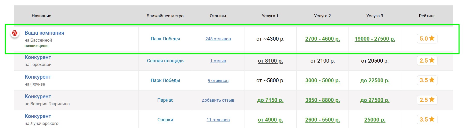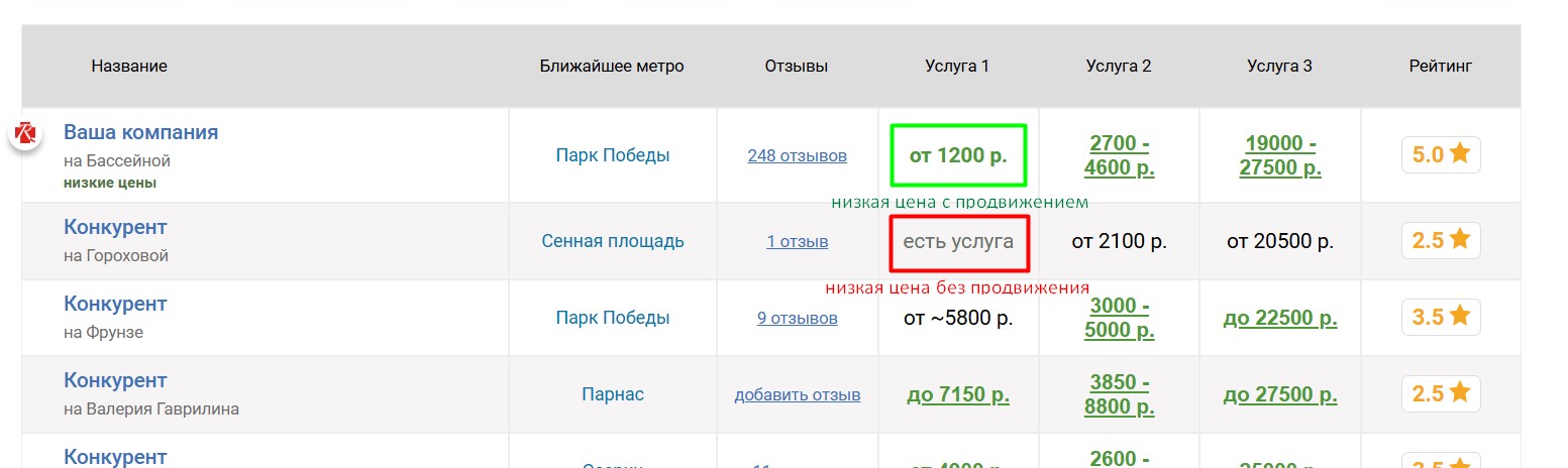 Вокруг продвигаемого таким образом антикафе выбирается некоторое количество ближайших конкурирующих антикафе, продвигаемое антикафе попадёт к ним в таблицу «Сравнение по ценам», которая выглядит следующим образом: